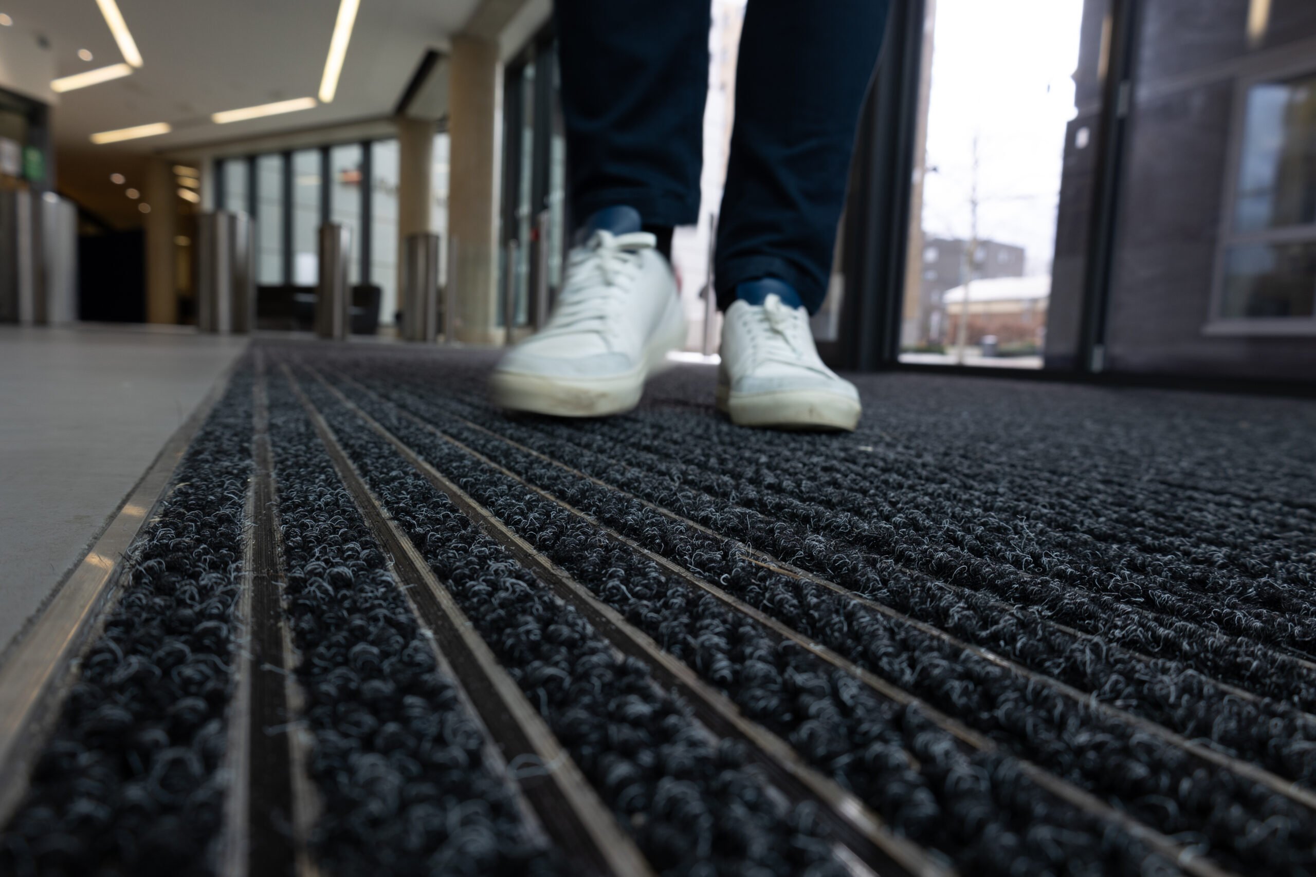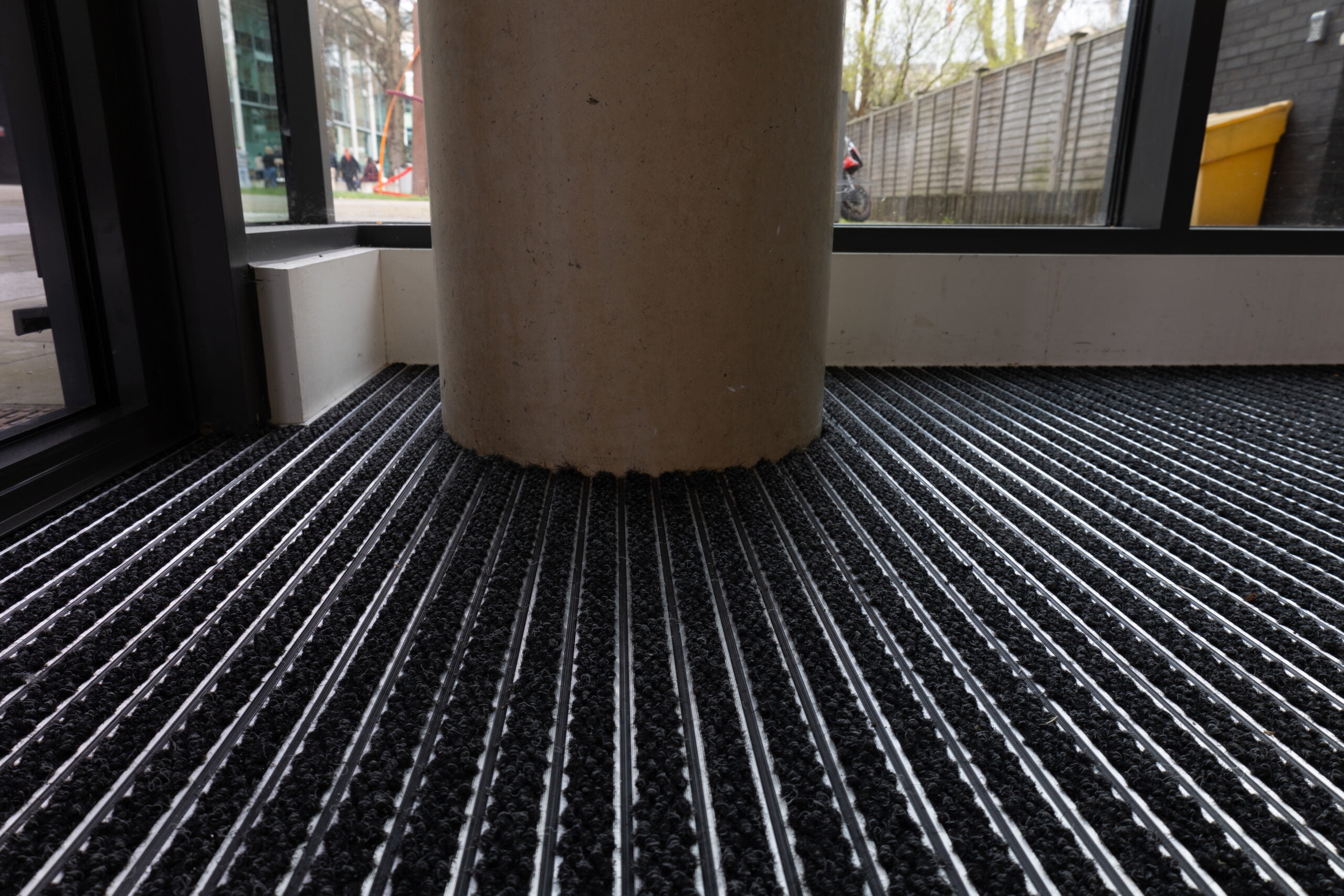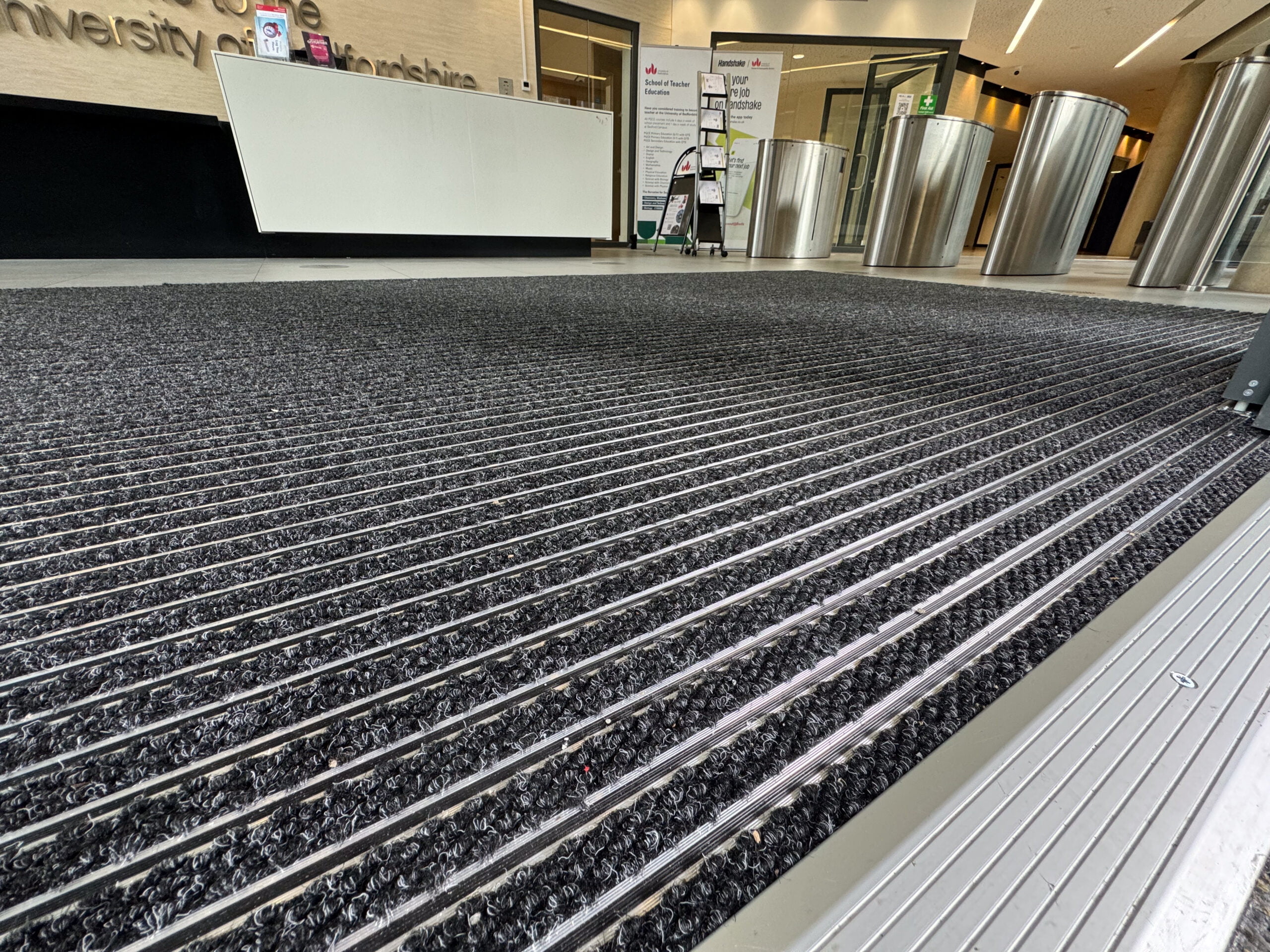 Plan.a is a high-end entrance matting product and is also COBA Flooring’s best-selling solution. Offering excellent product performance along with options for design customisation. Plan.a can be tailored to suit an array of building styles and entrance configurations. Comprised of an aluminium rail system linked with flexible joints, it offers the utmost durability for busy buildings. Genuinely handmade to order in the UK, providing reassurance of precision and quality. Needlepunch inserts are available in charcoal and grey to be sympathetic to most commercial entrance designs and offer a less expensive carpet surface that still provides effective cleaning action. Bedfordshire University’s Luton campus opted for the charcoal option.